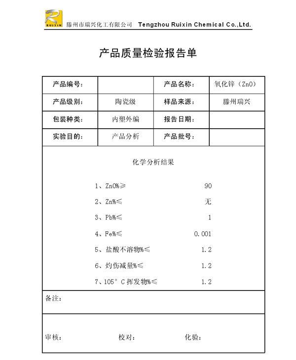 瑞興化工有限公司是生產(chǎn)氧化鋅的重點企業(yè),于2008年通過ISO9001:2008質(zhì)量管理體系認(rèn)證。“瑞興”牌氧化鋅在國內(nèi)擁有較大穩(wěn)定的市場,并遠(yuǎn)銷東南亞、中東、中南美等國家和地區(qū),在國內(nèi)外享有較高聲譽。